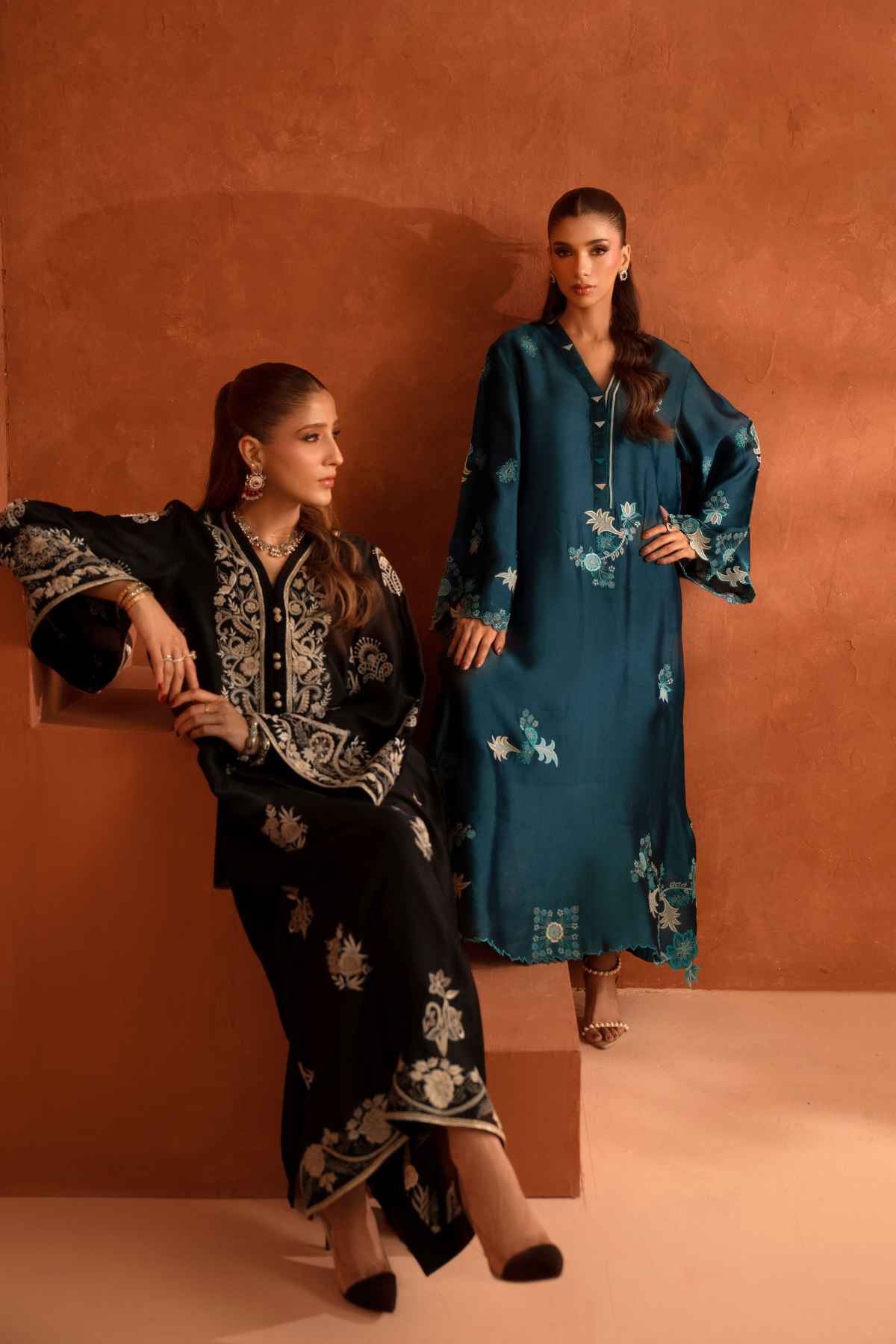 The black kaftan features extensive, traditional embroidery in a contrasting gold and off-white thread. It has a straight silhouette and wide sleeves, finished with a heavily detailed embroidered border along the hem and cuffs.