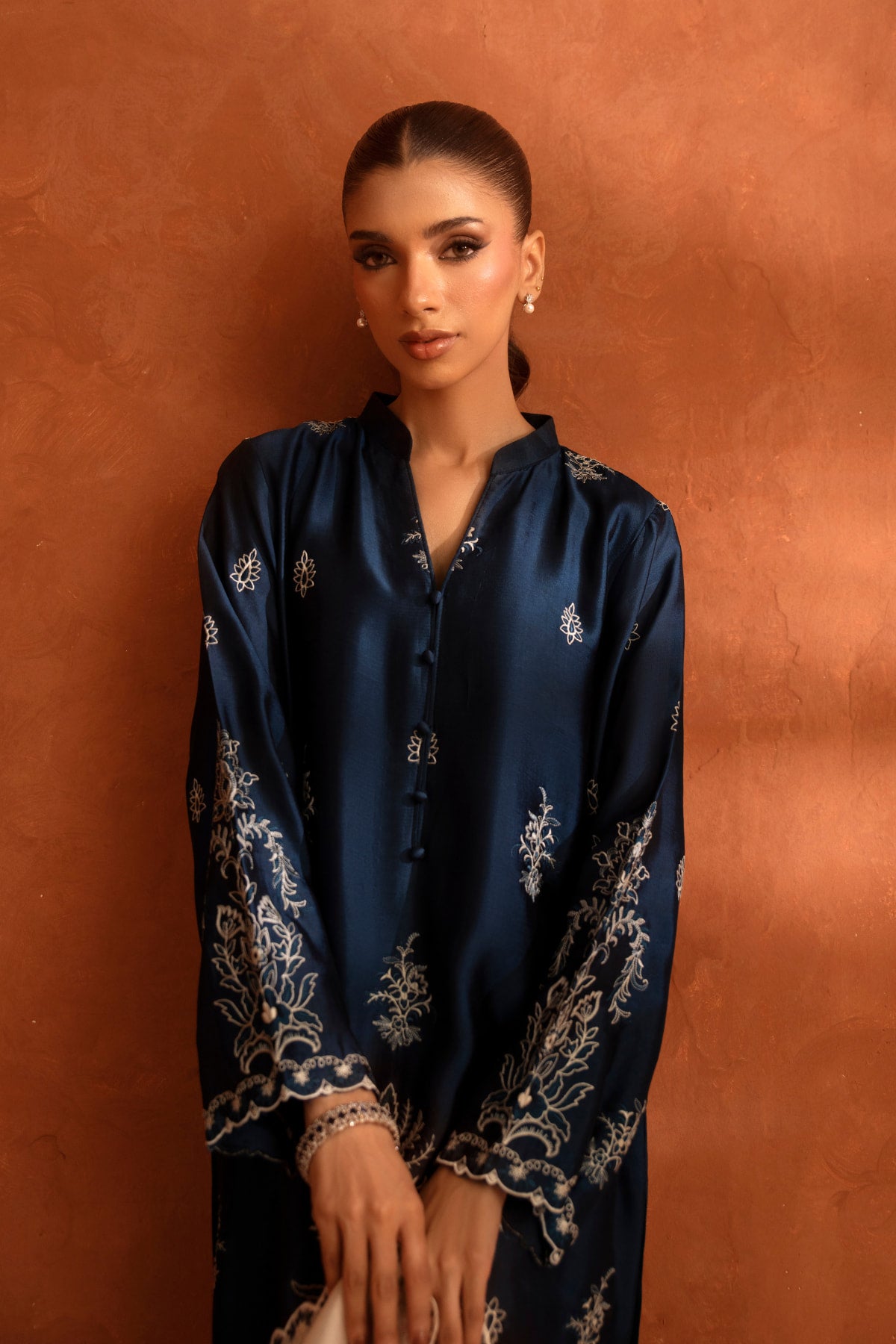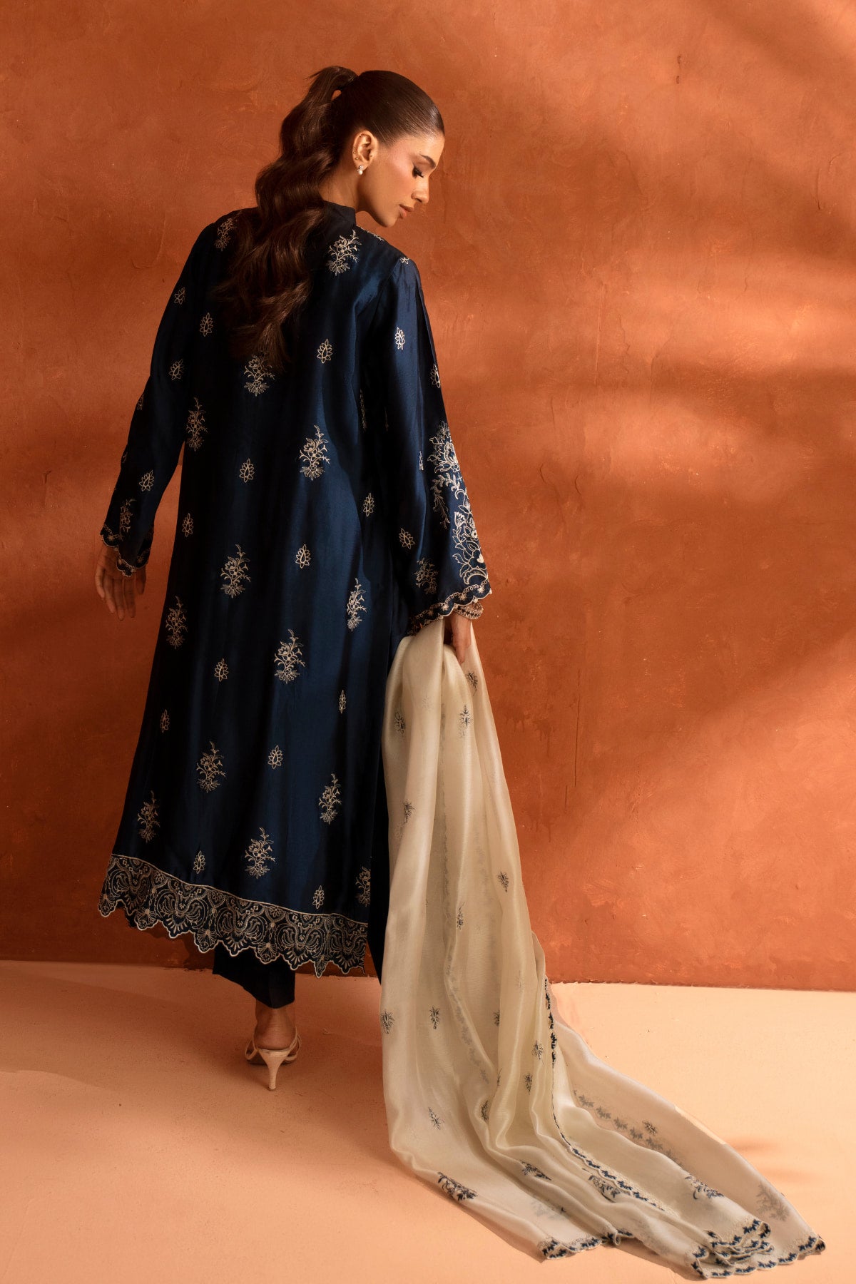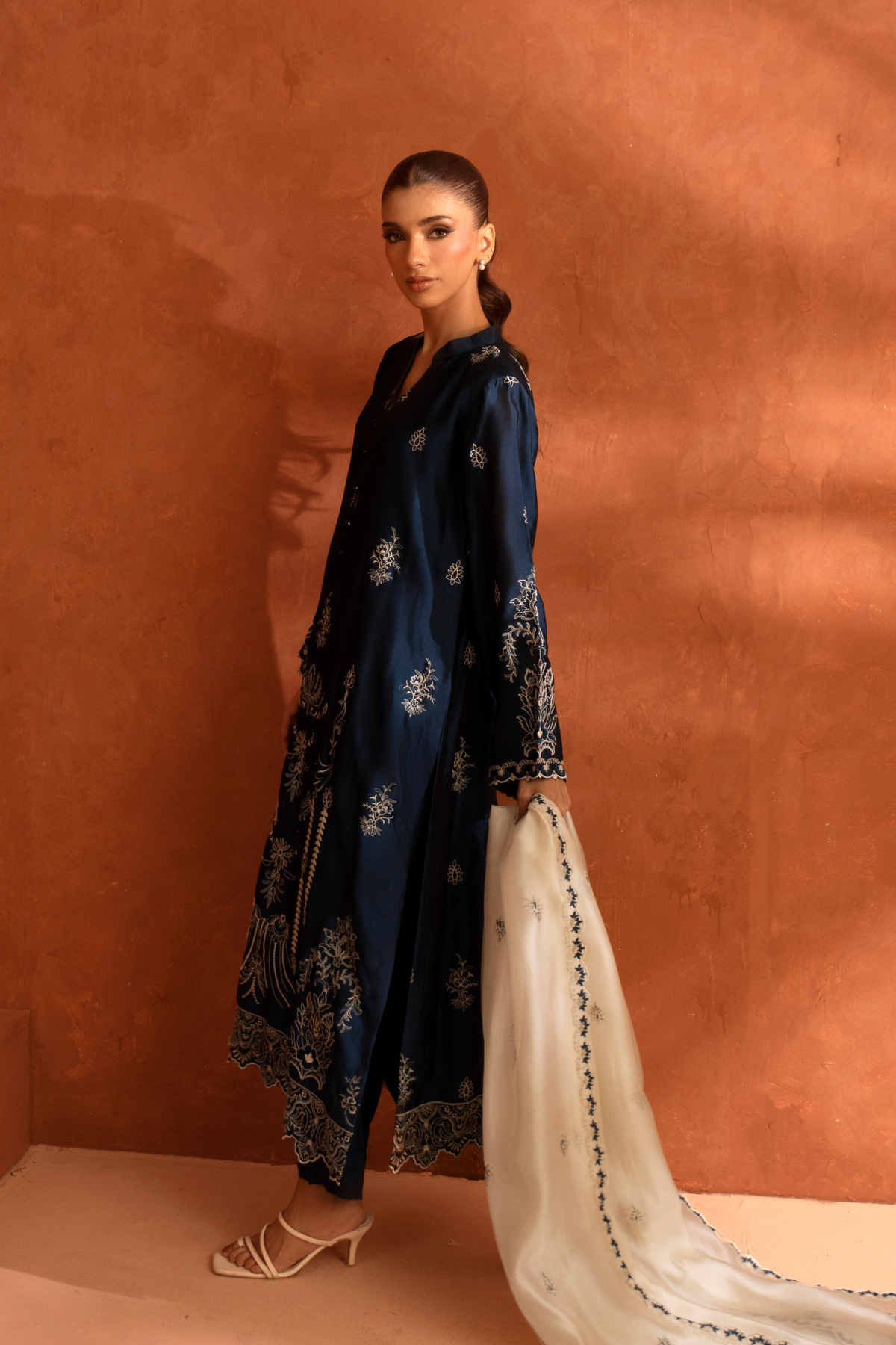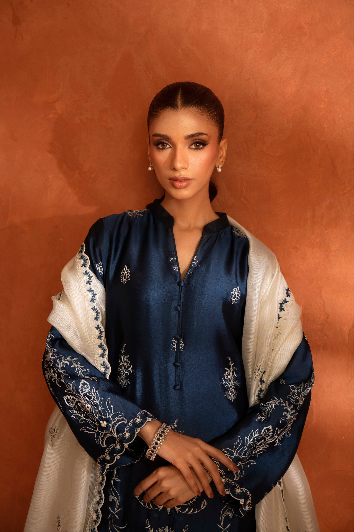 A stunning ensemble in deep navy blue, featuring intricate white and silver thread embroidery in a delicate floral and vine pattern along the torso, hem, and sleeves. It is paired with straight matching trousers and a contrasting off-white dupatta with subtle embroidery on dupatta.