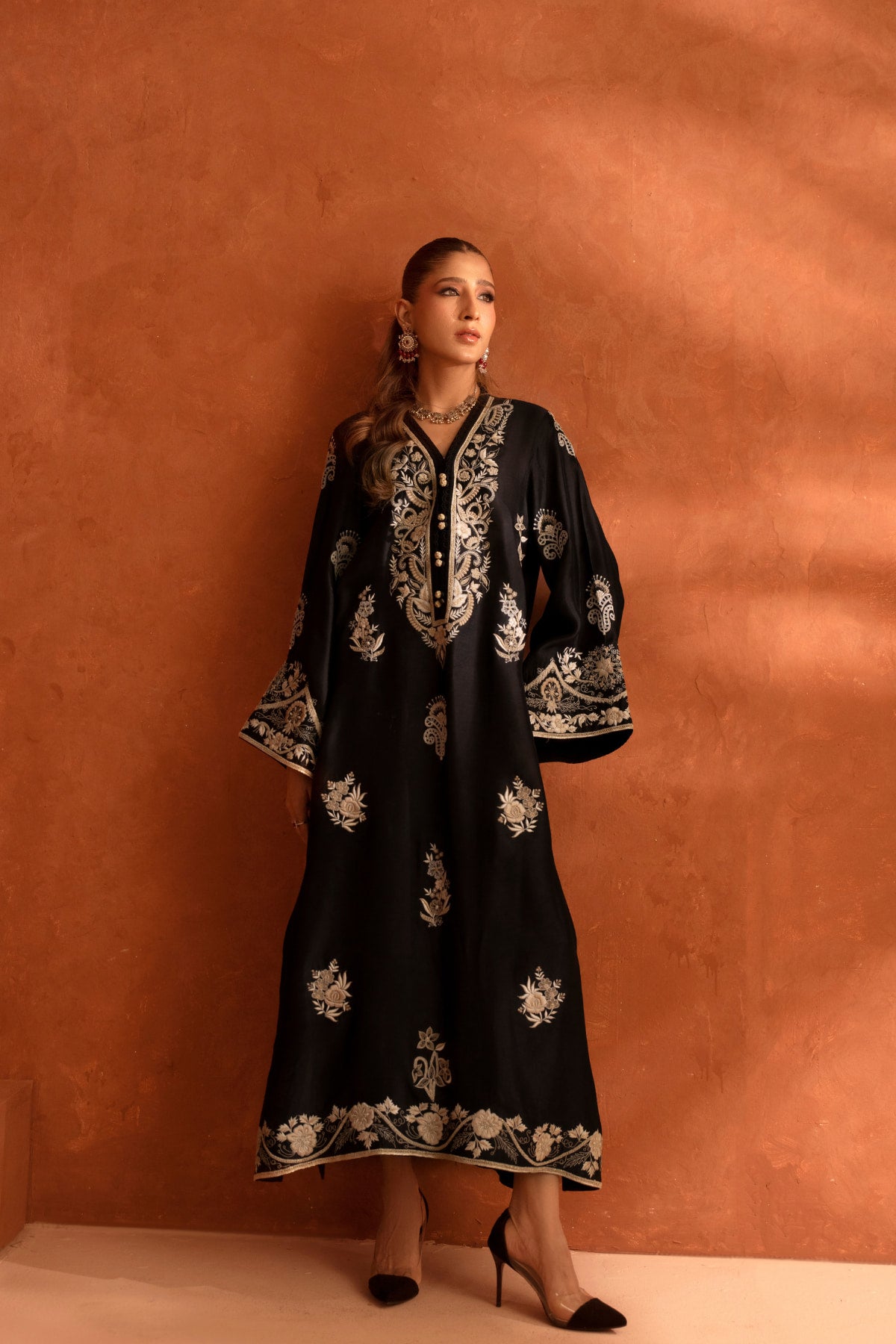 The black kaftan features extensive, traditional embroidery in a contrasting gold and off-white thread. It has a straight silhouette and wide sleeves, finished with a heavily detailed embroidered border along the hem and cuffs.